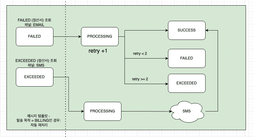 정산서 메시지가 EXCEEDED 상태가 되면 이메일 대신 SMS 채널로 fallback 발송을 수행한다. SMS 발송은 실패하지 않는다는 가정 하에 처리되며, SMS 전송이 완료되면 최종적으로 SUCCESS 상태로 확정된다. 이 흐름을 통해 정산서 메시지는 외부 시스템 장애나 일시적인 오류가 발생하더라도 시스템이 개입 없이 자동으로 복구를 시도하고, 최종적으로 사용자에게 전달되도록 설계했다.