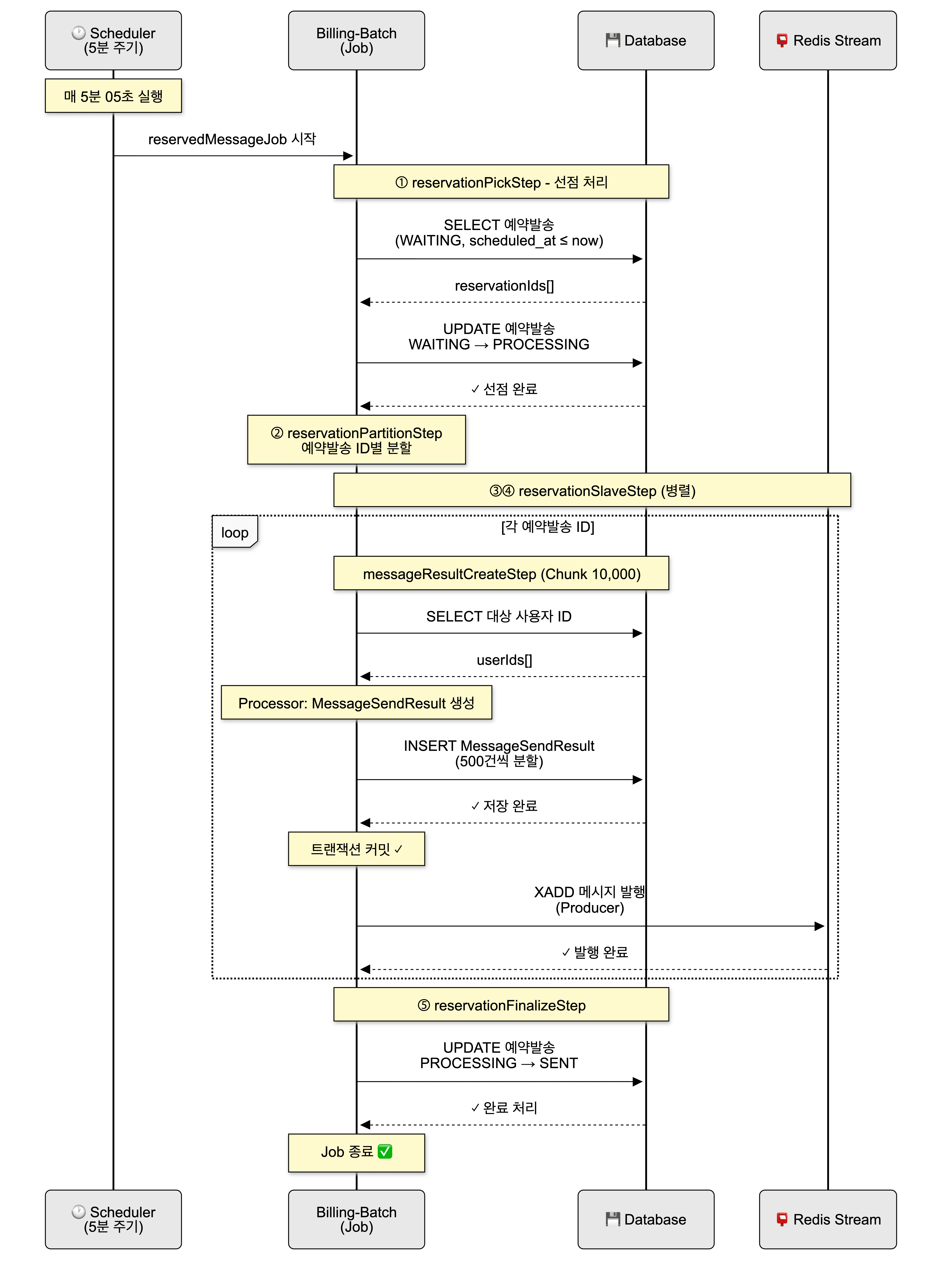 예약 발송은 billing-batch의 ReservedMessageScheduler가 5분 주기로 실행하며, 예약 발송 처리 전반을 Spring Batch Job으로 수행한다. Job은 예약 발송을 선점하고(WAITING → PROCESSING), 예약 발송 ID 단위로 파티셔닝한 뒤 사용자별 메시지 상태를 생성하고 Redis Stream에 발송 요청을 발행한다. 이때 billing-batch는 메시지 발송 요청을 Redis Stream에 적재하는 Producer 역할을 맡으며, 메시지 발행은 DB 트랜잭션 커밋 이후에만 수행되도록 구성해 Consumer가 항상 커밋된 데이터만 조회하도록 보장했다.
