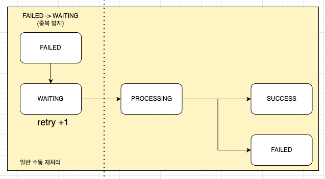 정산서 목적이 아닌 일반 메시지는 자동 재시도 대상에서 제외했다. 일반 메시지는 템플릿 오류, 발송 대상 설정 오류 등 관리자의 판단이 필요한 실패 원인이 많다고 판단했기 때문이다. 이러한 메시지가 실패하면 FAILED 상태로 종료되며, 관리자 화면에서 수동 재시도 요청이 들어온 경우에만 재처리 흐름으로 다시 진입한다.